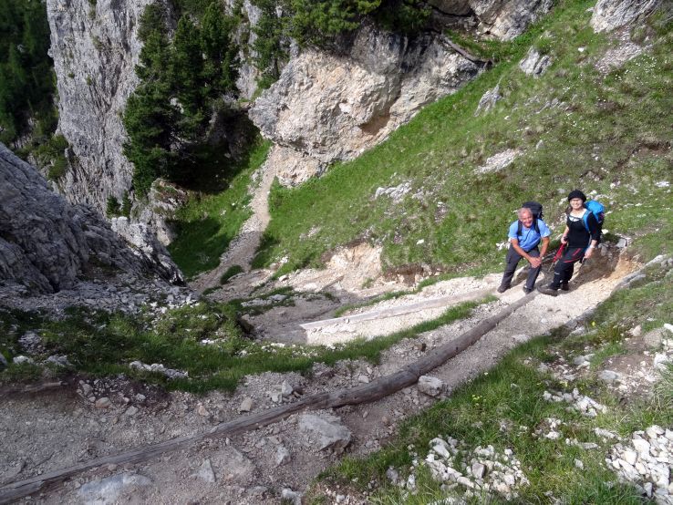 Die erste Hälfte der Gruppe ging auf direktem Weg über die Scoiattoli Hütte und Averau Hütte zur Nuvolau Hütte, während die zweite Hälfte in flottem Tempo Richtung Passo di Giau marschierte und über 2 kurze Klettersteige den Gipfel des Nuvolau bestieg. Dort steht statt eines Gipfelkreuzes eine Madonna, die immer zu ein paar besinnlichen Gedanken einlädt.
